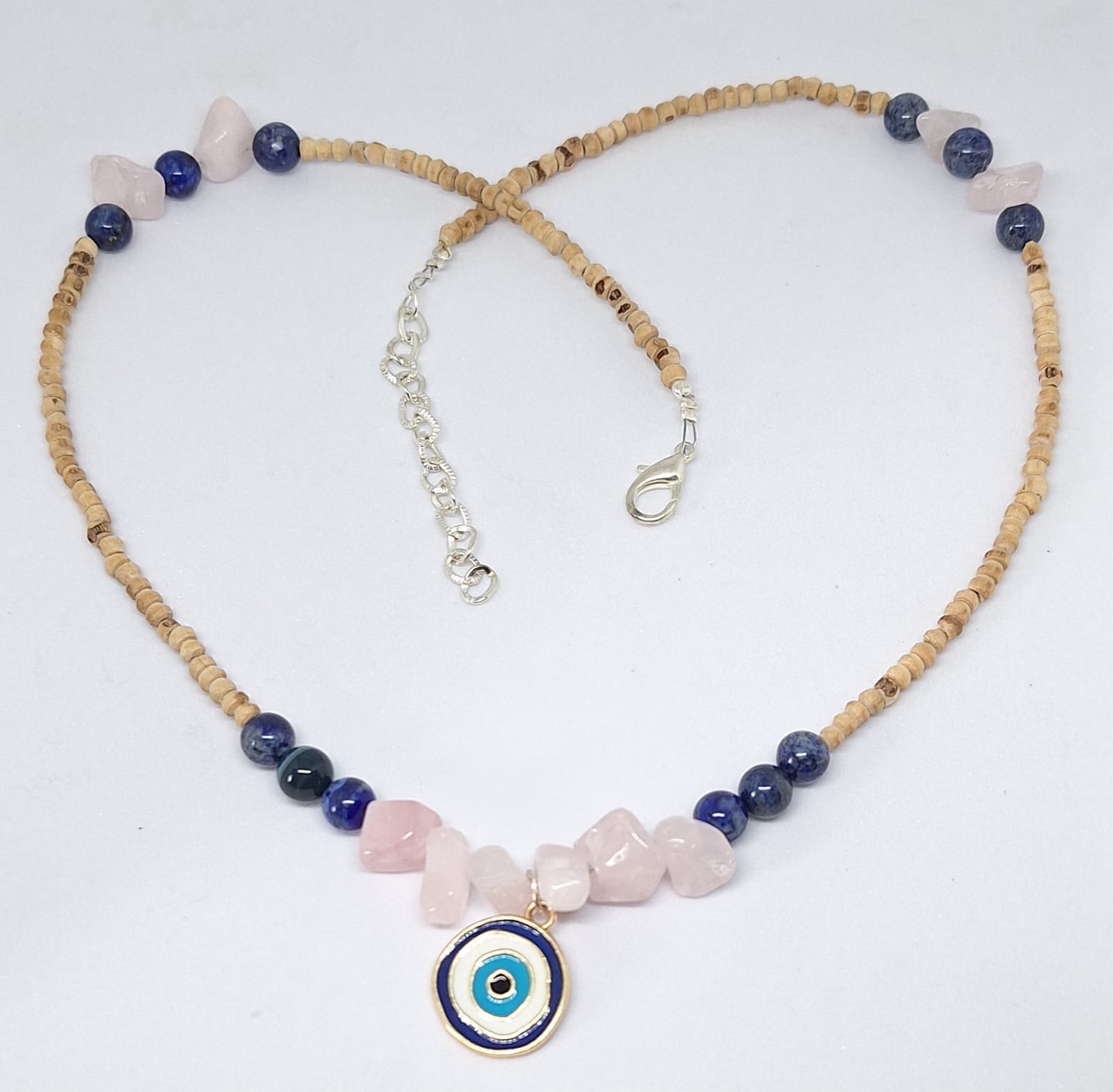Evil Eye Lapis Lazuli Rose Quartz Pendant 56cm Necklace – Healing Communication and Mental Clarity